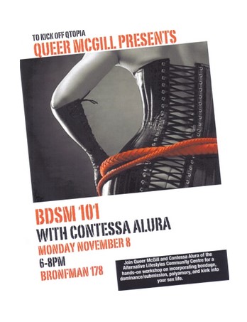 Queer McGill – QTOPIA Rad Sex Week Workshops: Bondage for Beginners (Jan 31, 2011) and Basic Flogging (Feb 1, 2011) by Contessa Alura